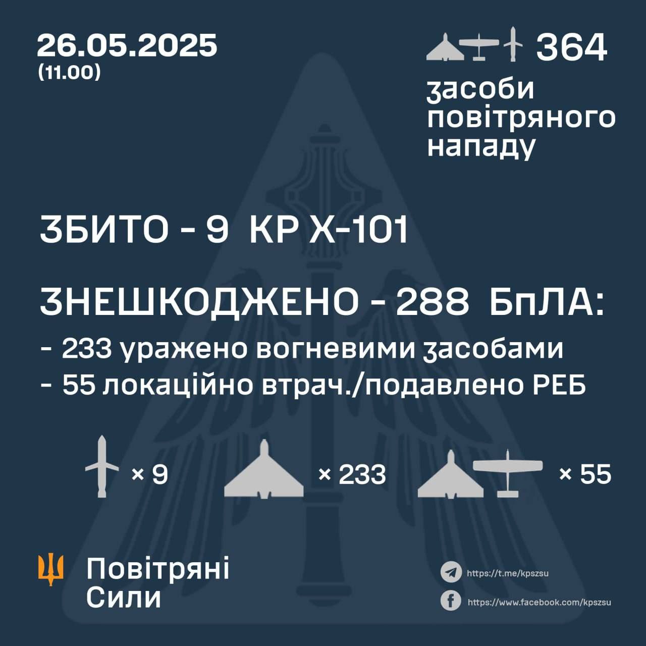В ночь на 26 мая Россия нанесла третий подряд комбинированный удар по Украине, на этот раз с применением 364-х средств воздушного нападения: ПВО сбила 9 крылатых ракет и обезвредила 288 вражеских БПЛА.