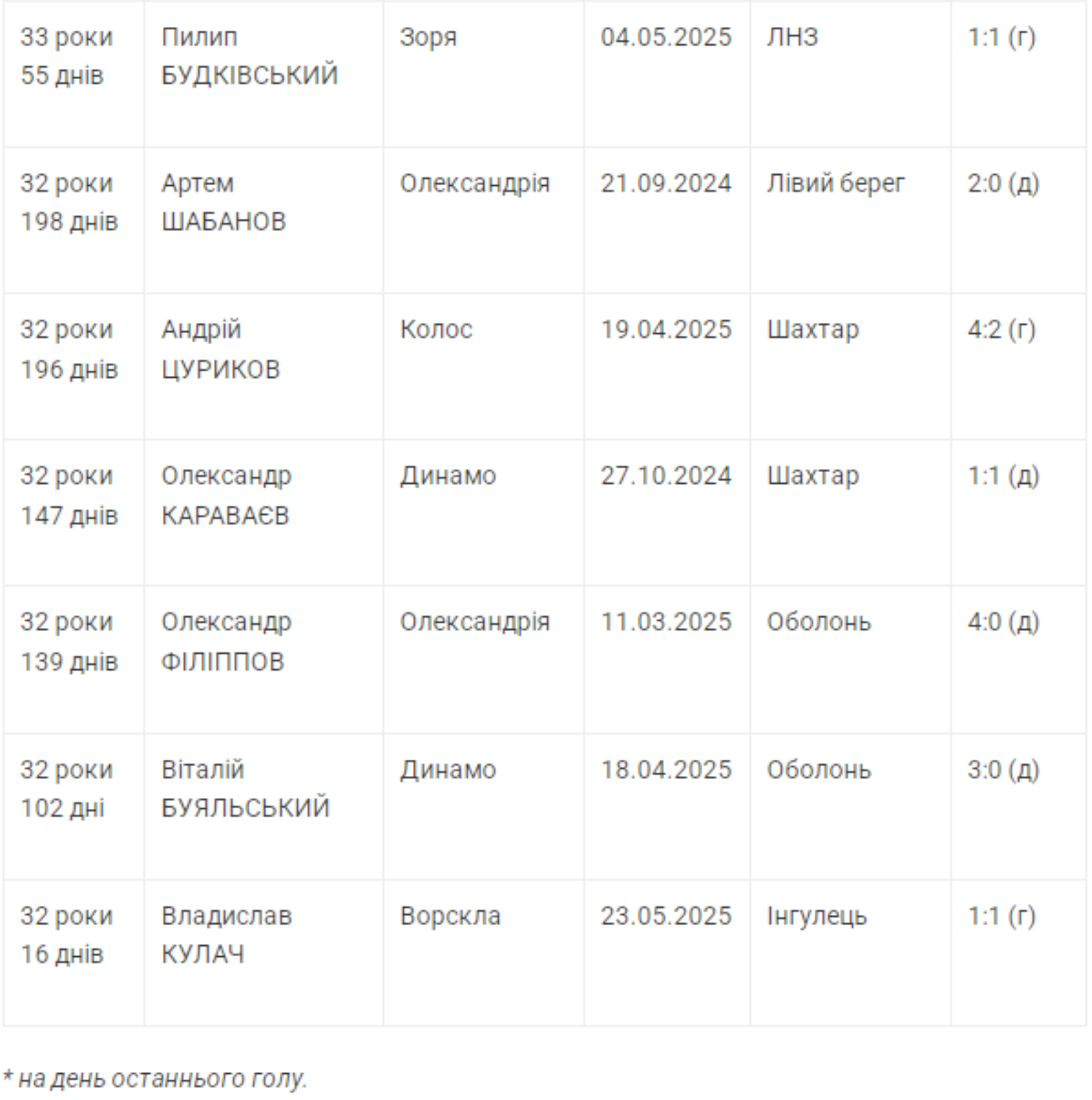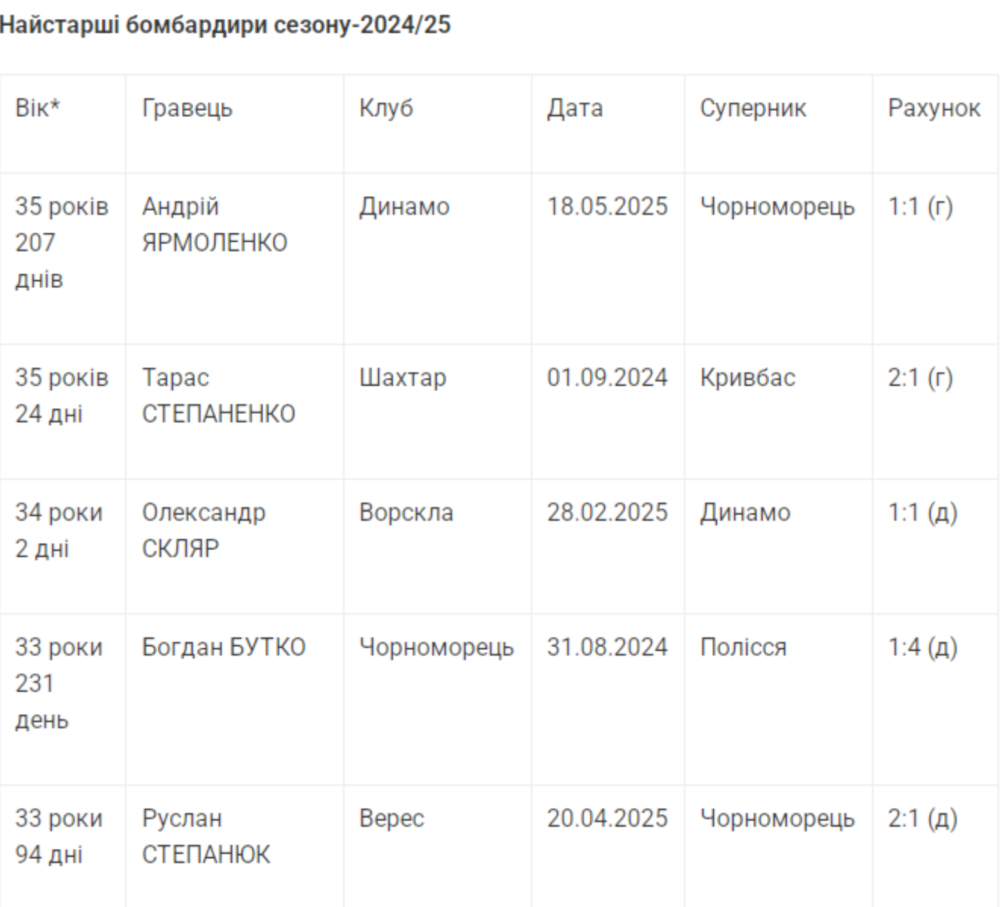 В сезоне-2024/25 отличились взятием ворот 12 ветеранов старше 32-х лет. Старшим из них оказался хавбек "Динамо" Андрей Ярмоленко, забивший в 29-м туре "Черноморцу" в 35 лет 207 дней.