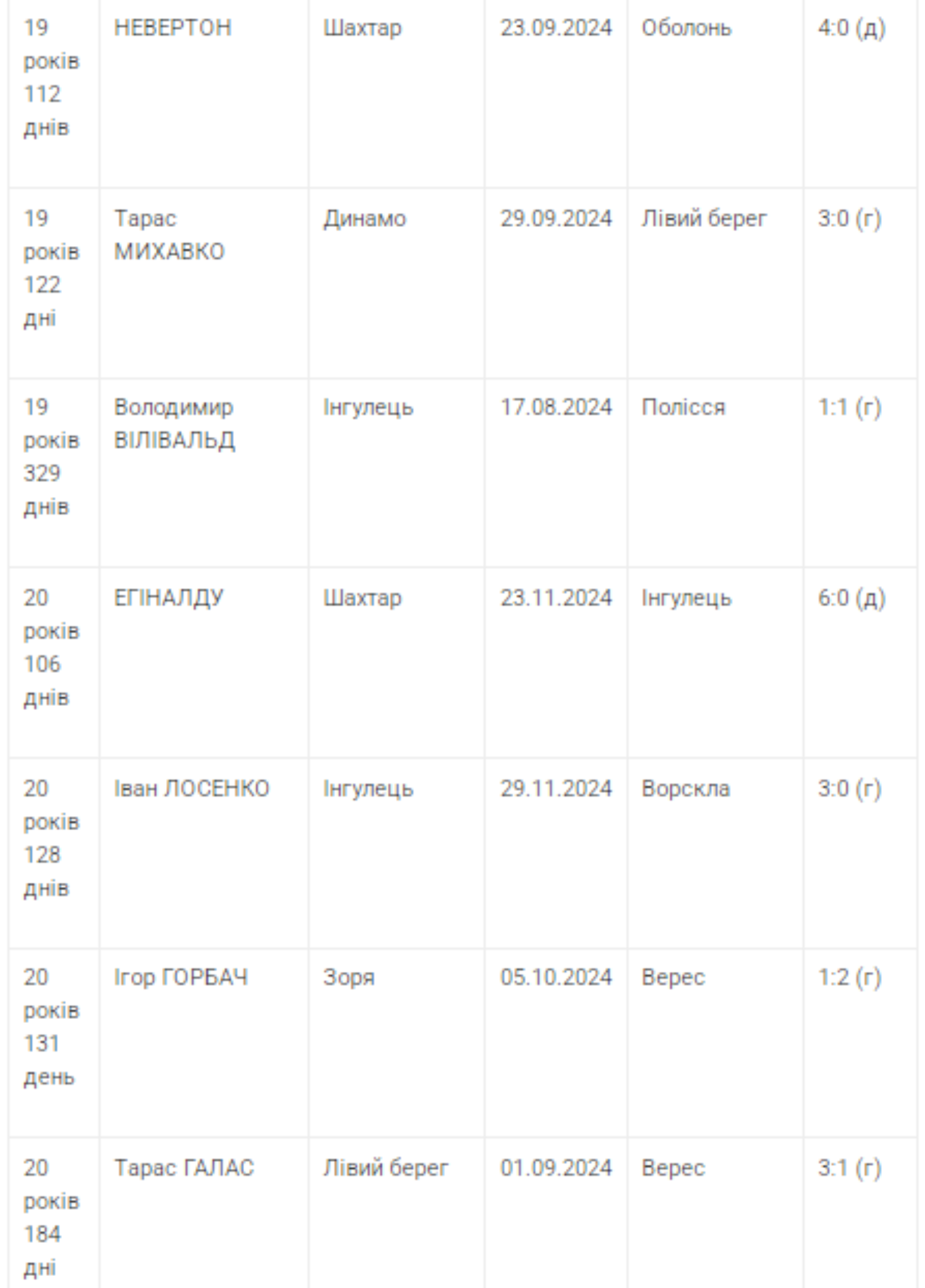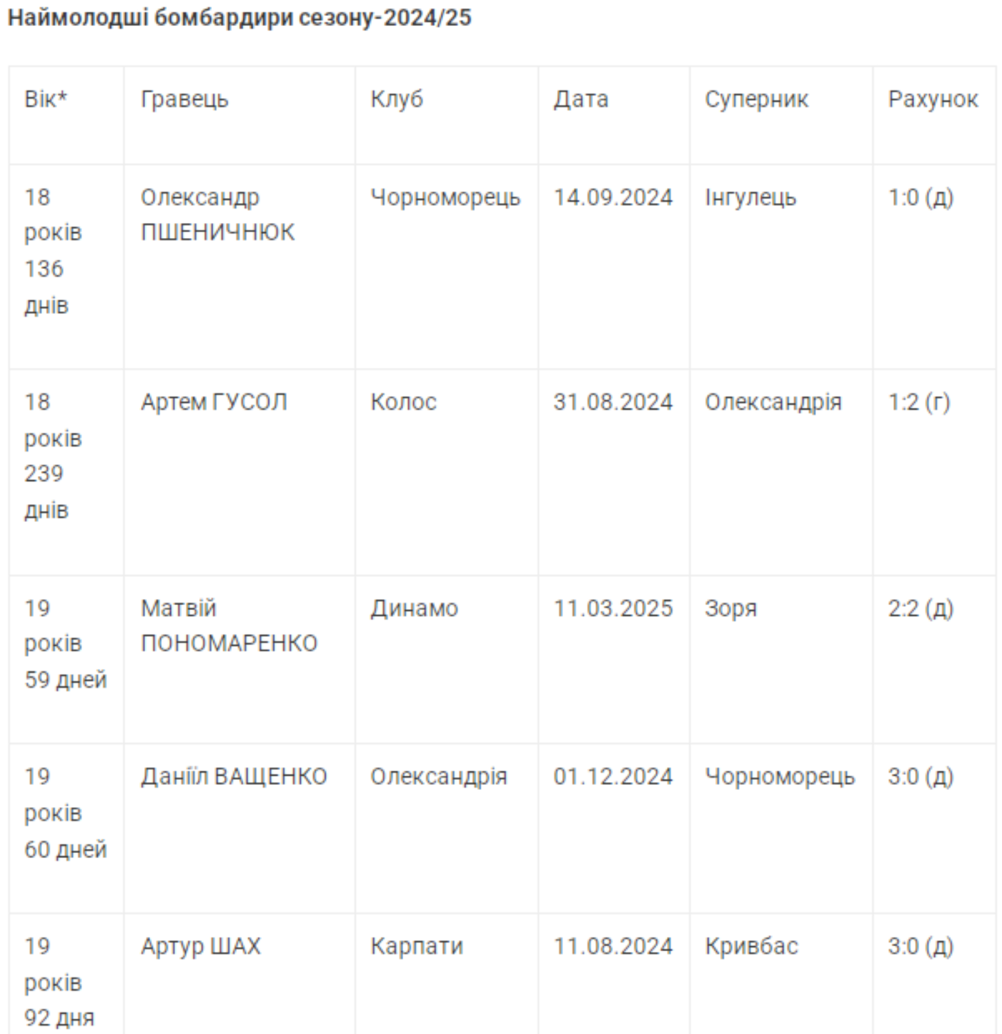 В свою очередь на полях УПЛ-2024/25 отличились 8 юниоров младше 20-ти лет. Самым молодым из них оказался полузащитник "Черноморца" Александр Пшеничнюк, открывший свой голевой счет в украинских чемпионатах в матче против "Ингульца" в 18 лет 136 дней. А список молодых бомбардиров-иностранцев, как и год назад, возглавил бразильский хавбек "Шахтера" Невертон – 19 лет 112 дней.