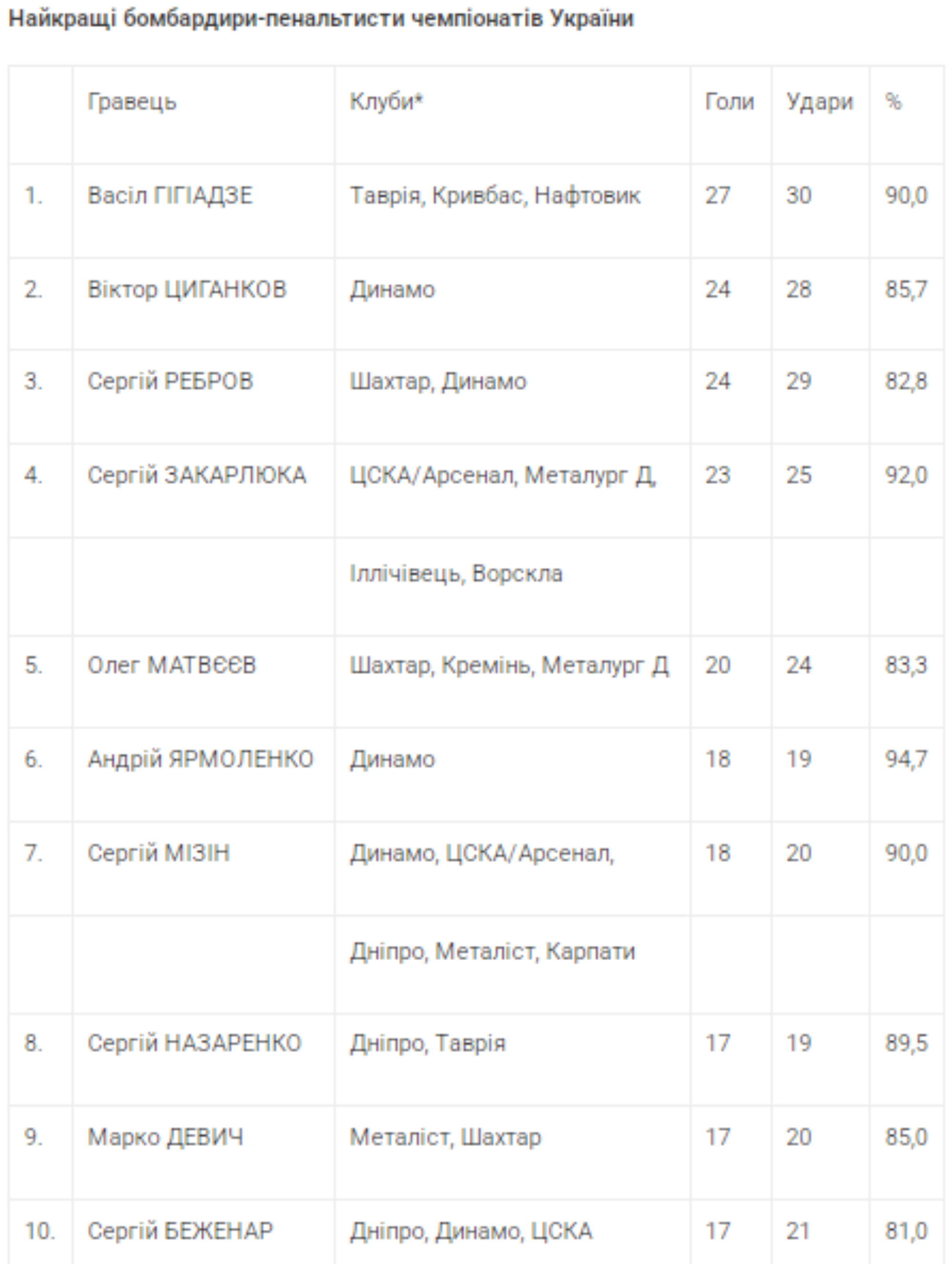 К слову, Ярмоленко, за карьеру забивший в УПЛ с одиннадцатиметровой отметки 18 мячей, вышел на шестое место в списке лучших бомбардиров-пенальтистов чемпионатов Украины. А результативная серия Андрея из 18-ти точных ударов подряд уступает только рекорду УПЛ Василию Гигиадзе.
