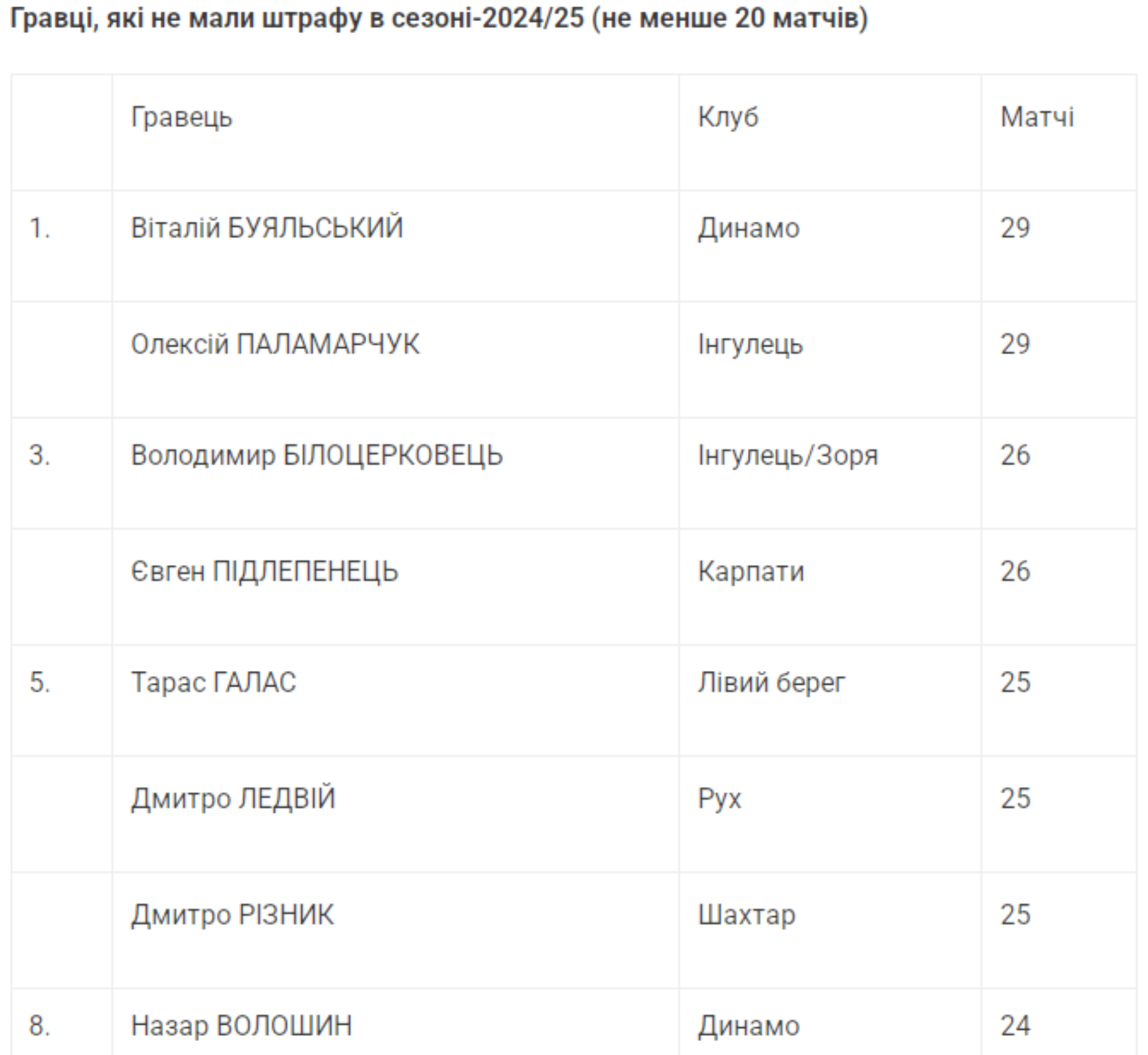 Из этой когорты своего рода джентльменов наибольшее количество встреч отыграли 32-летний полузащитник "Динамо" Виталий Буяльский и 33-летний голкипер "Ингульца" Алексей Паламарчук – по 29, таким образом и получившие звание самых дисциплинированных футболистов чемпионата.