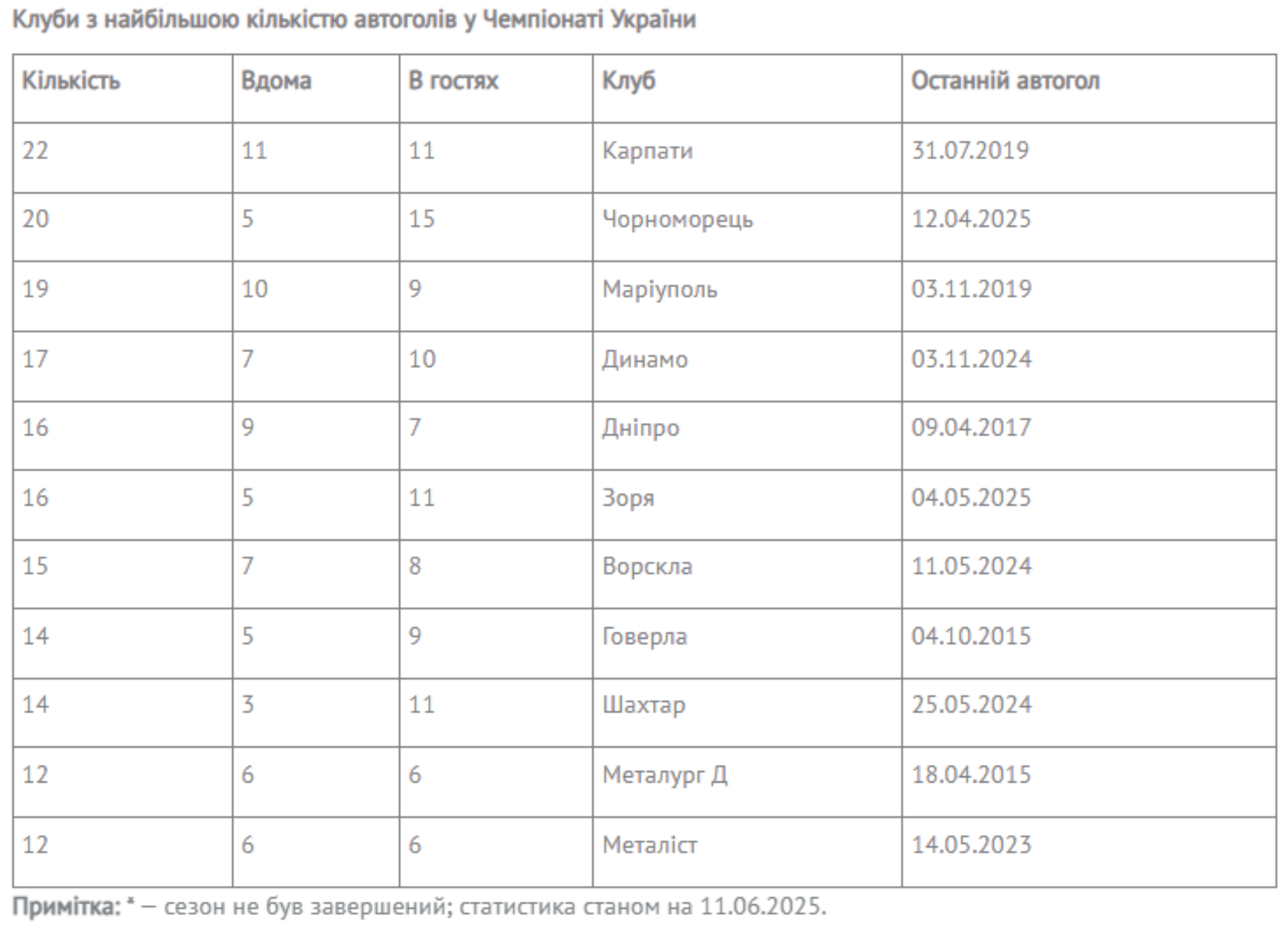 Среди 46-ти клубов больше всего голов в свои ворота у игроков "Карпат" - 22 автогола, а чаще всего забивали голы в свои ворота соперники "Шахтера" - 47 раз.