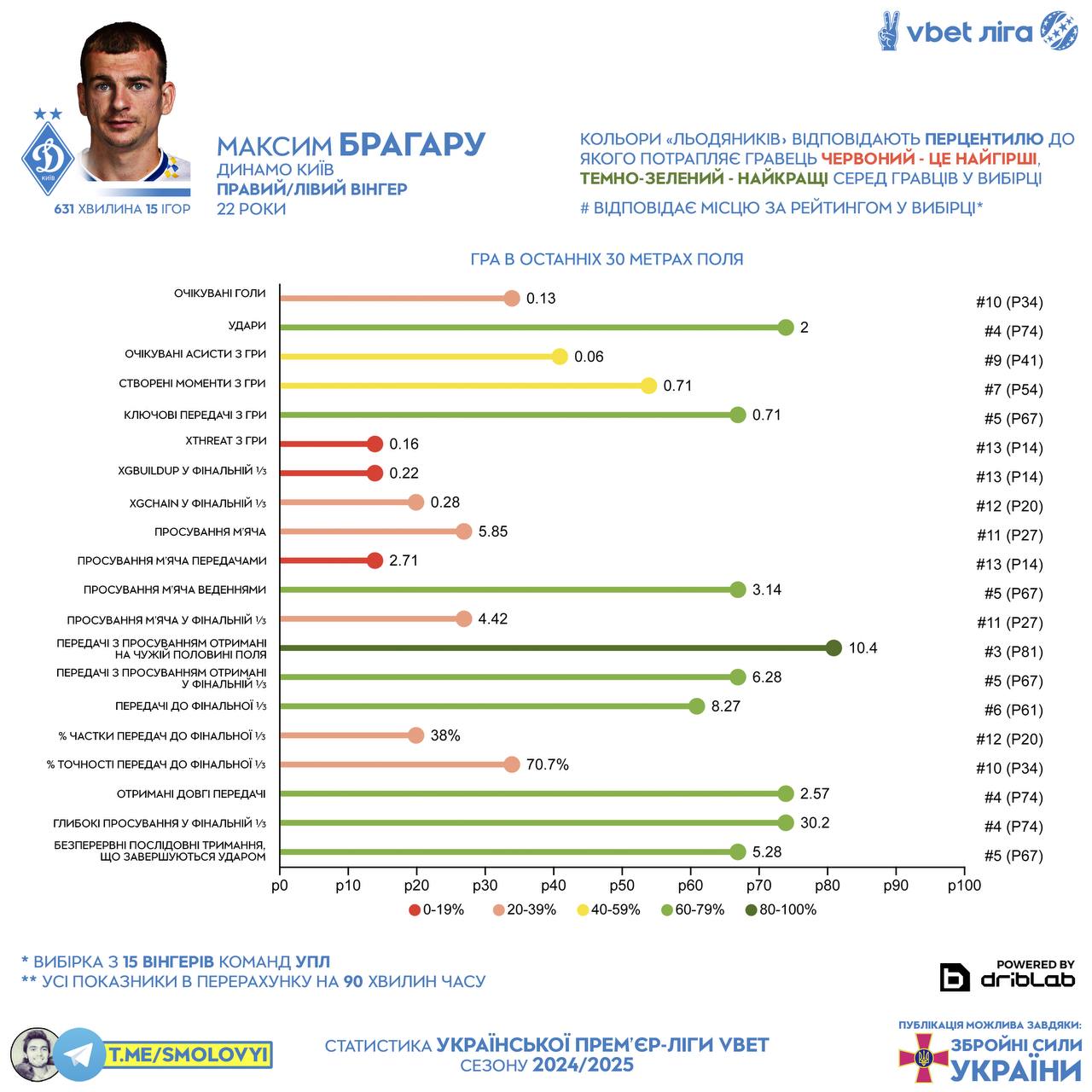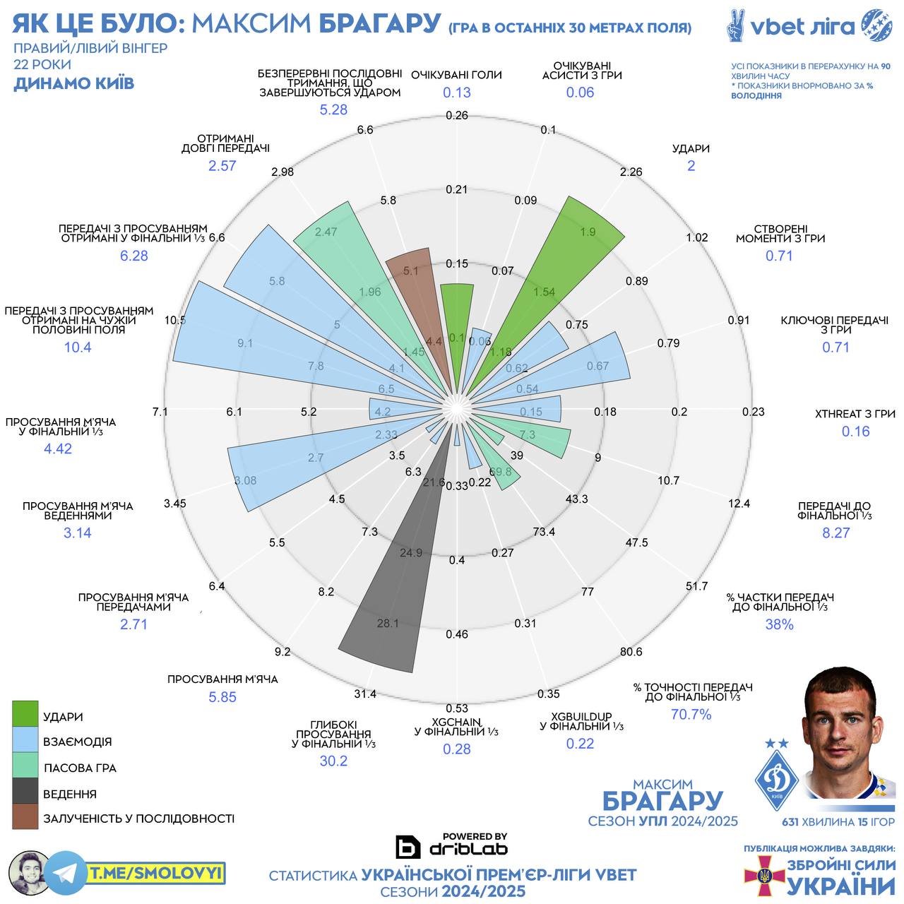 6. Проблема конкретно в качестве финального продукта, удары были, но бессмысленны по ~0.065 xG; то же с ключевыми; 0.16/90 xThreat – один из худших показателей среди вингеров УПЛ.