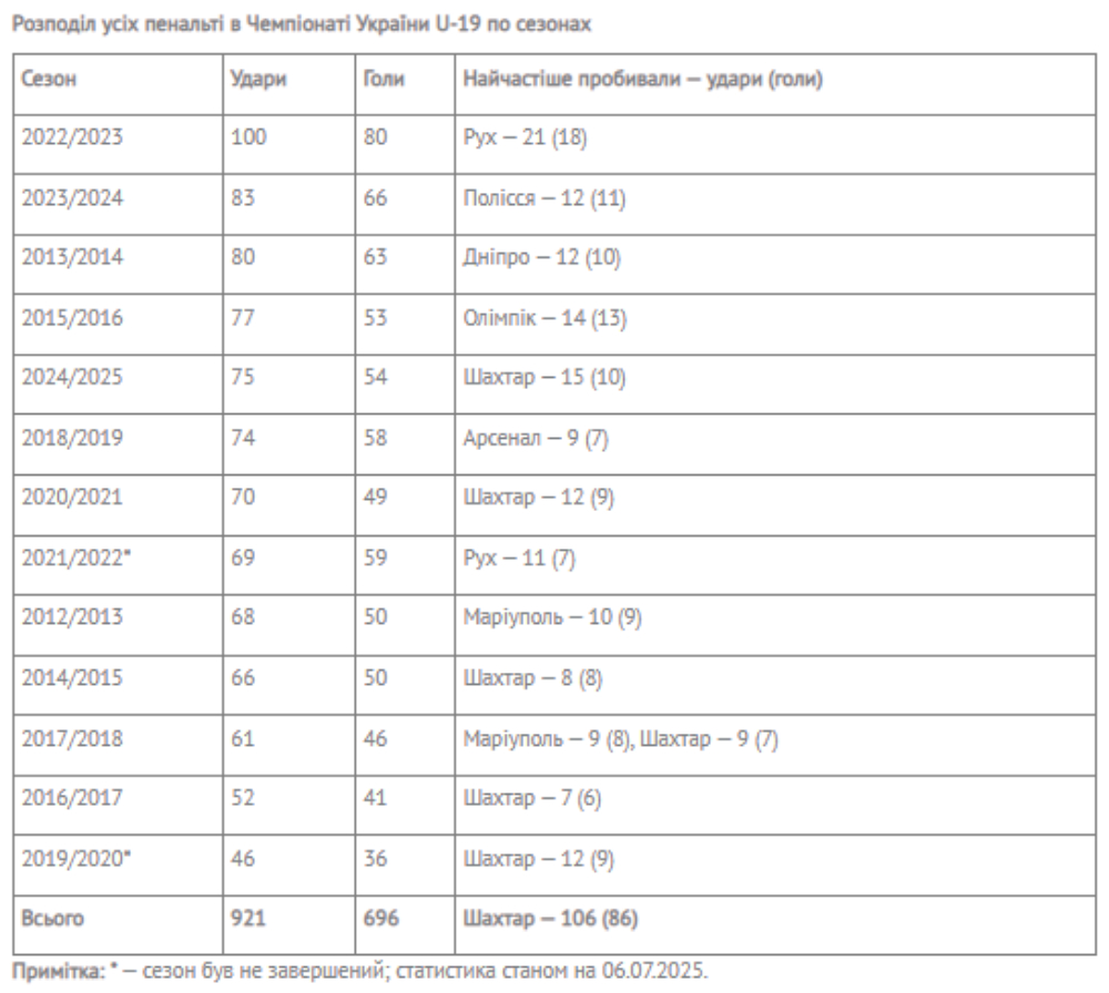 В сезоне 2024/25 в первенстве Украины U-19 арбитры 75 раз назначали 11-метровые удары, а реализованных пенальти было 54. По количеству ударов с "отметки" прошлый сезон занимает 5-е место в историческом рейтинге.