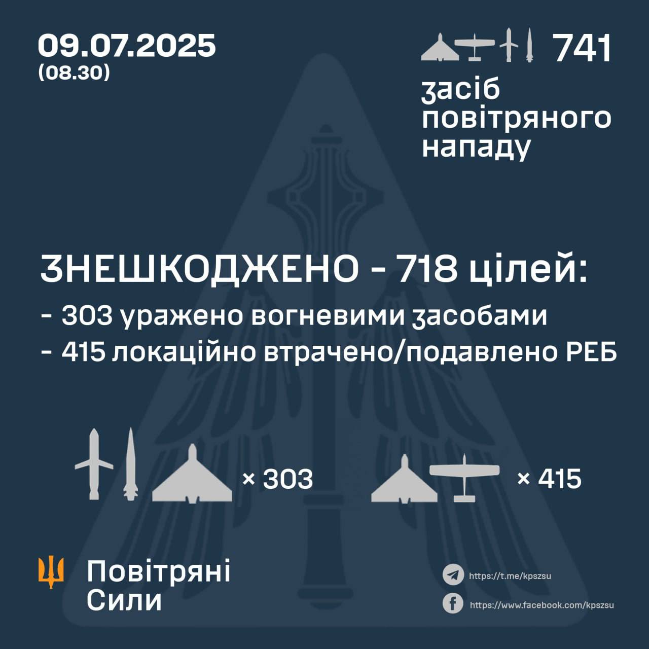 По предварительным данным, по состоянию на 08.30 противовоздушной обороной обезврежено 718 средств воздушного нападения противника, 303 – сбиты огневыми средствами, 415 – локационно потеряны: