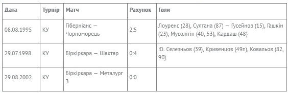 У «Чорноморця» (1995 рік), «Шахтаря» (1998) та запорізького «Металурга» (2002) проблем із опонентами не було. В шести матчах українські команди здобули п’ять перемог із загальним рахунком 16:3, і тільки одна зустріч завершилася унічию — 0:0.
