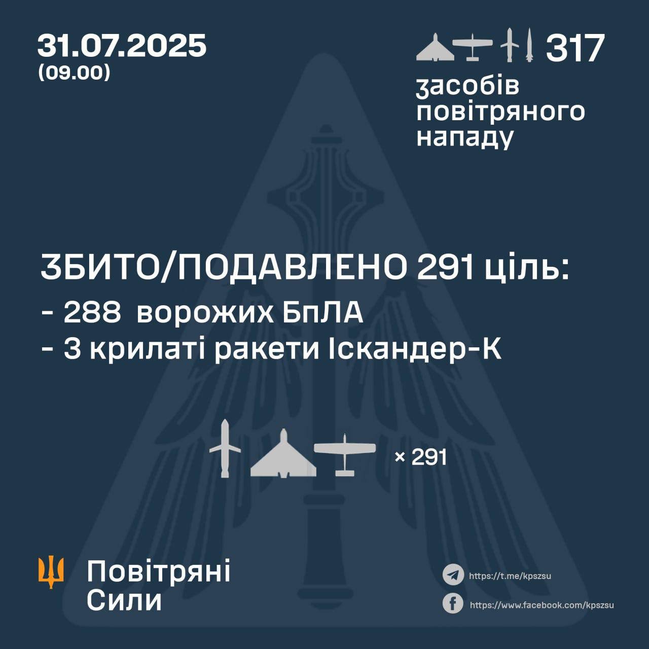 Всего враг запустил 317 средств воздушного нападения, из них были сбиты или подавлены 288 дронов и 3 крылатые ракеты.