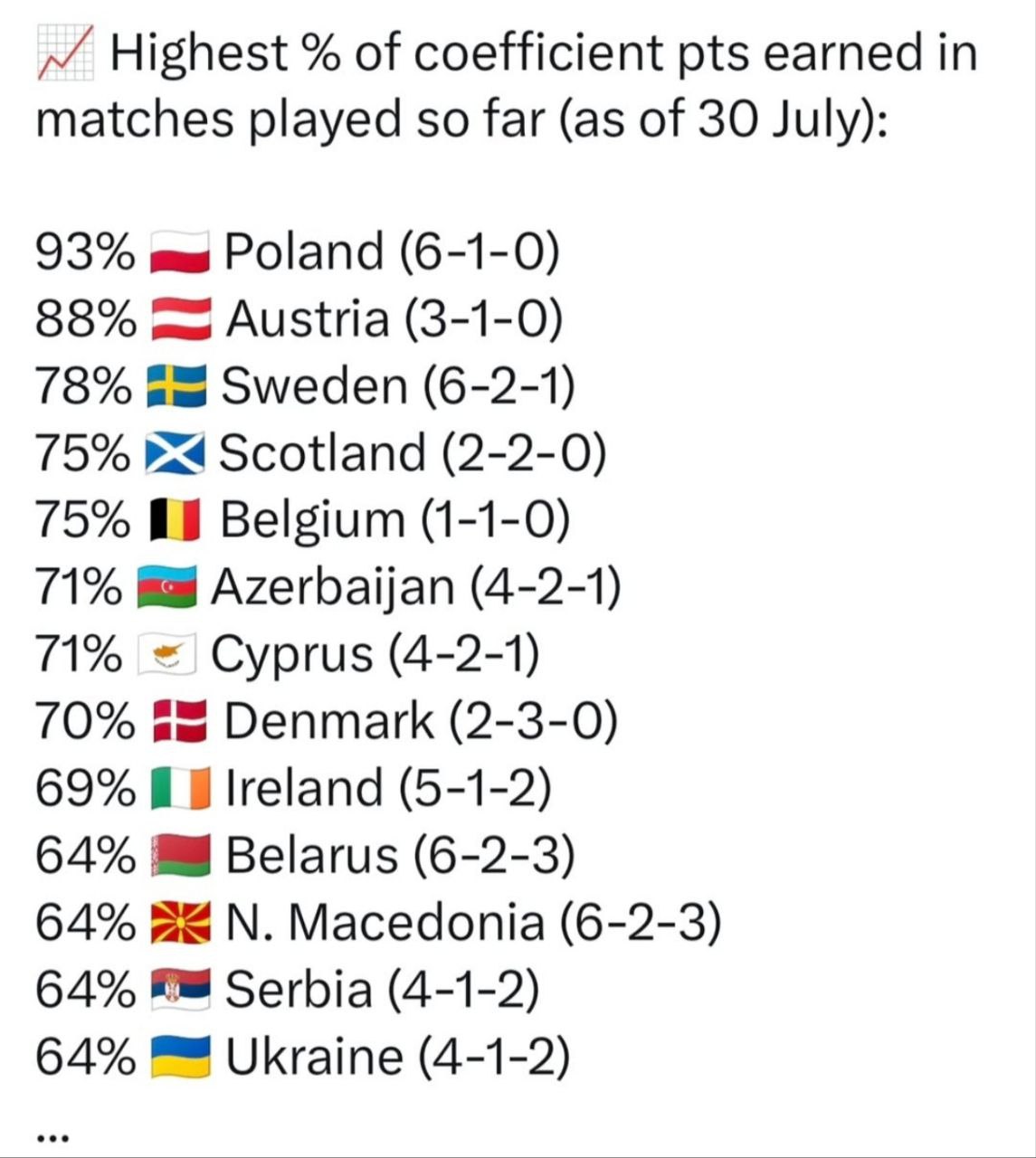 По этому показателю Украина разделяет 10-13 места с Беларусью, Северной Македонией и Сербией. А на вершине рейтинга пока расположилась Польша (93%).