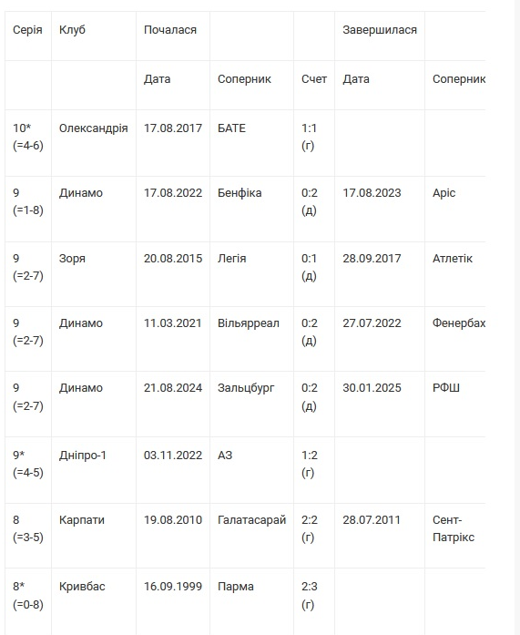 Найтриваліші безвиграшні серії українських клубів в єврокубках