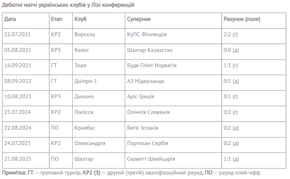 Украинские клубы провели уже 48 матчей в Лиге конференций: 13 побед, 9 ничьих и 26 поражений, мячи 52-79.