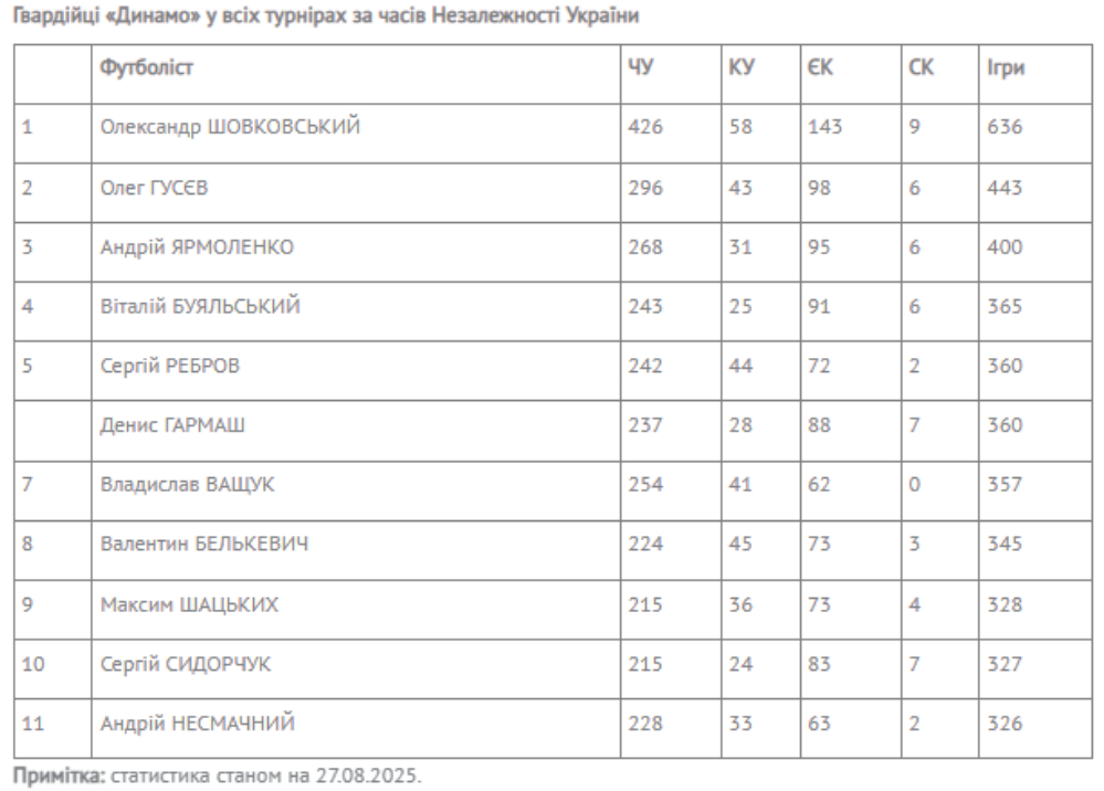 По количеству игр Ярмоленко стал 3-м в списке гвардейцев-динамовцев во времена независимости, кому подчинился этот важный рубеж. Во всех 400 матчах в составе "Динамо" он забил 157 голов.