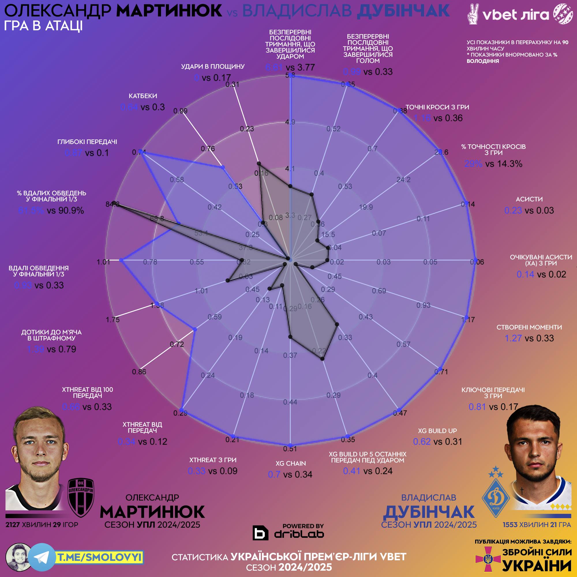 – Дубинчак привлекался в прошлом сезоне УПЛ к 6.61/90 ударных атак, Мартынюк – к 3.77/90.