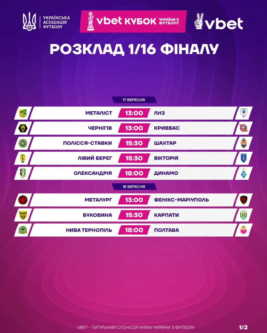 Определены даты и время матчей 1/16 финала VBET Кубка Украины сезона 2025/26.