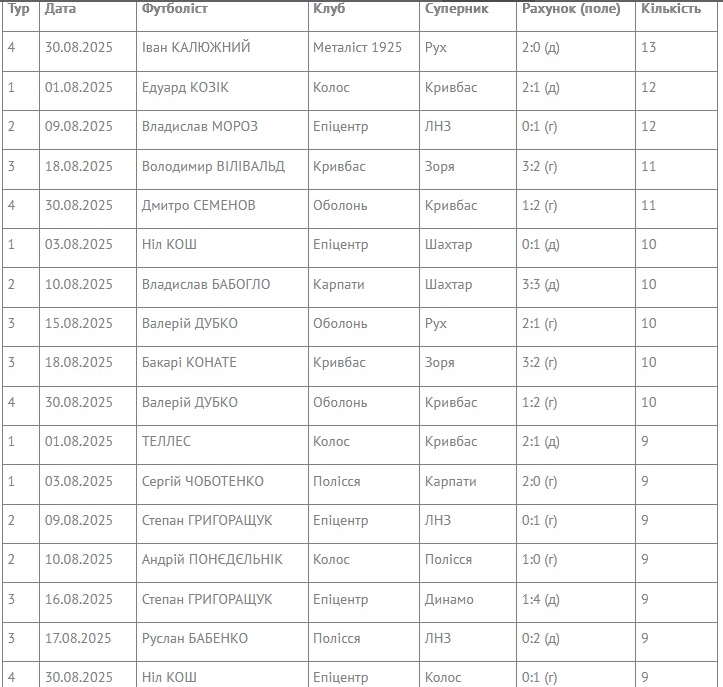 У матчі 4-го туру з «Рухом» півзахисник «Металіста 1925» та національної збірної України Іван Калюжний здійснив 13 перехоплень м’яча і підняв планку рекорду сезону 2025/26 у Чемпіонаті УПЛ. Попереднє топ-досягнення утримували на двох захисники Едуард Козік («Колос») та Владислав Мороз («Епіцентр»).