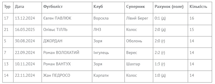 Найбільша кількість перехоплень м’яча за матч в сезоні 2024/25