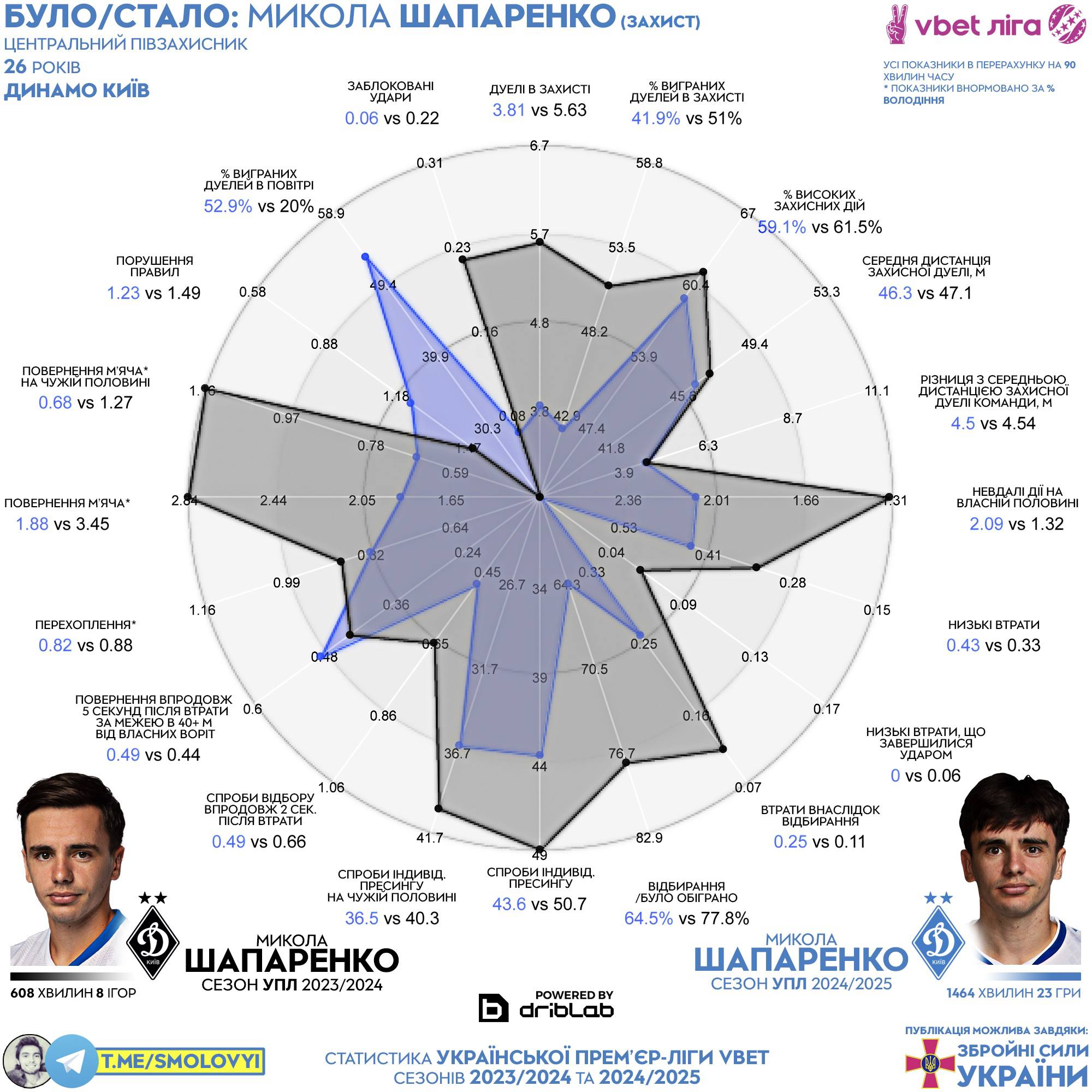 Повернімося до результатів роботи в Динамо Лисого та Шовковського. Атакувальний перформанс Шапи (https://t.me/smolovyi/9131) в УПЛ 2024/2025 - ледь не бездоганний. Шовковський упродовж сезону намагався посунути Буяльського нижче (той почав навіть у білдапі з’являтися), а Шапаренка підняти вище. Більш яскрава атакувальна роль Шапаренка прямо позначилася на деяких аспектах у грі без м’яча. І обсяги захисні впали в чомусь прогнозовано. Але вони впали й через банальну нездатність Шапаренка-2025 триматися на рівні інтенсивності Шапаренка-2022. Микола почав захищатися на 0,8 метра нижче, ніж два роки тому. Але тренд такий, що вся команда почала захищатися нижче, бо Шапа як був на рівні 4,5 метра нижче за команду, так там і лишився. Індивідуальний відсоток високих захисних дій упав не радикально (–2,4%).