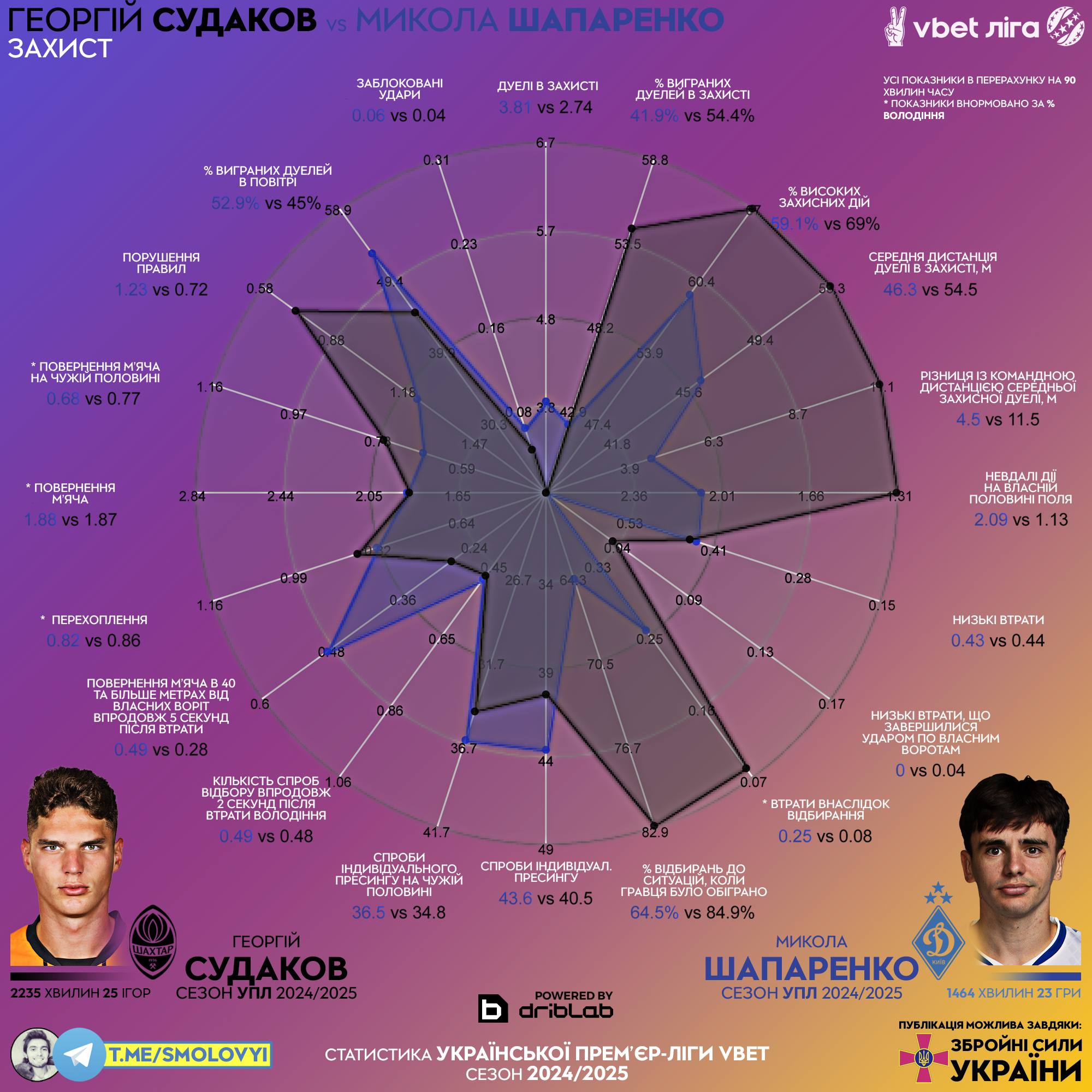 ⁃ Шапаренко теперь проигрывает Судакову ~12% по дуэлям в защите и уже Николая чаще на ~20% проходят, чем в предыдущем двухлетнем периоде