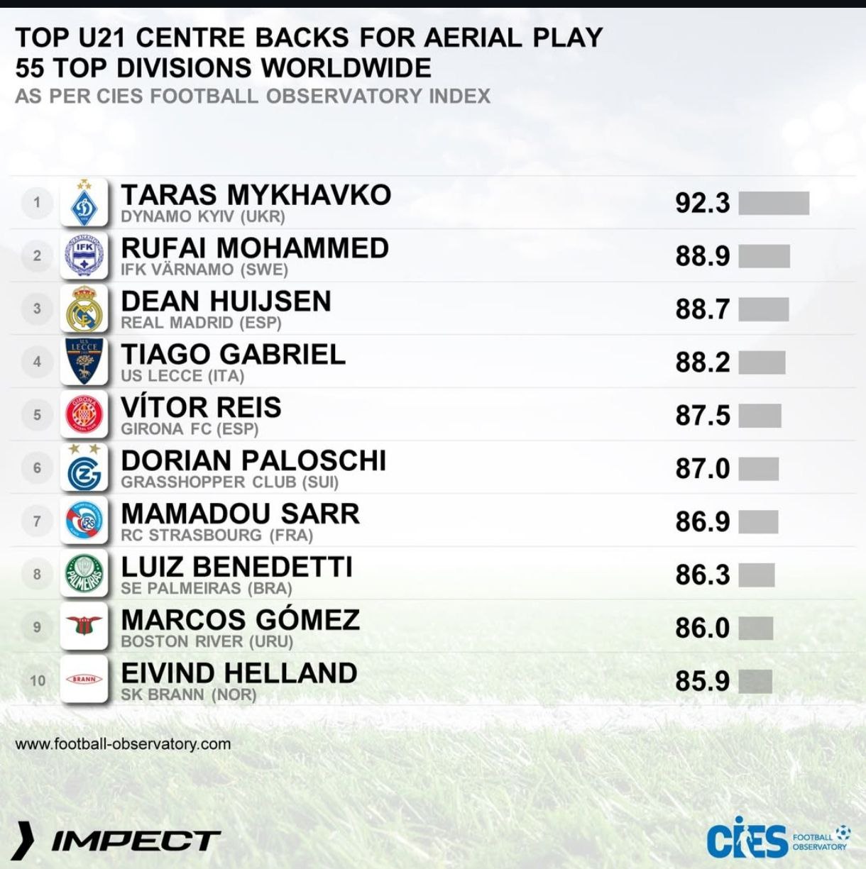 Международный центр спортивных исследований (CIES Football Observatory) обнародовал собственный рейтинг лучших защитников мира в возрасте до 21-го года по выигранным верховым дуэлям.