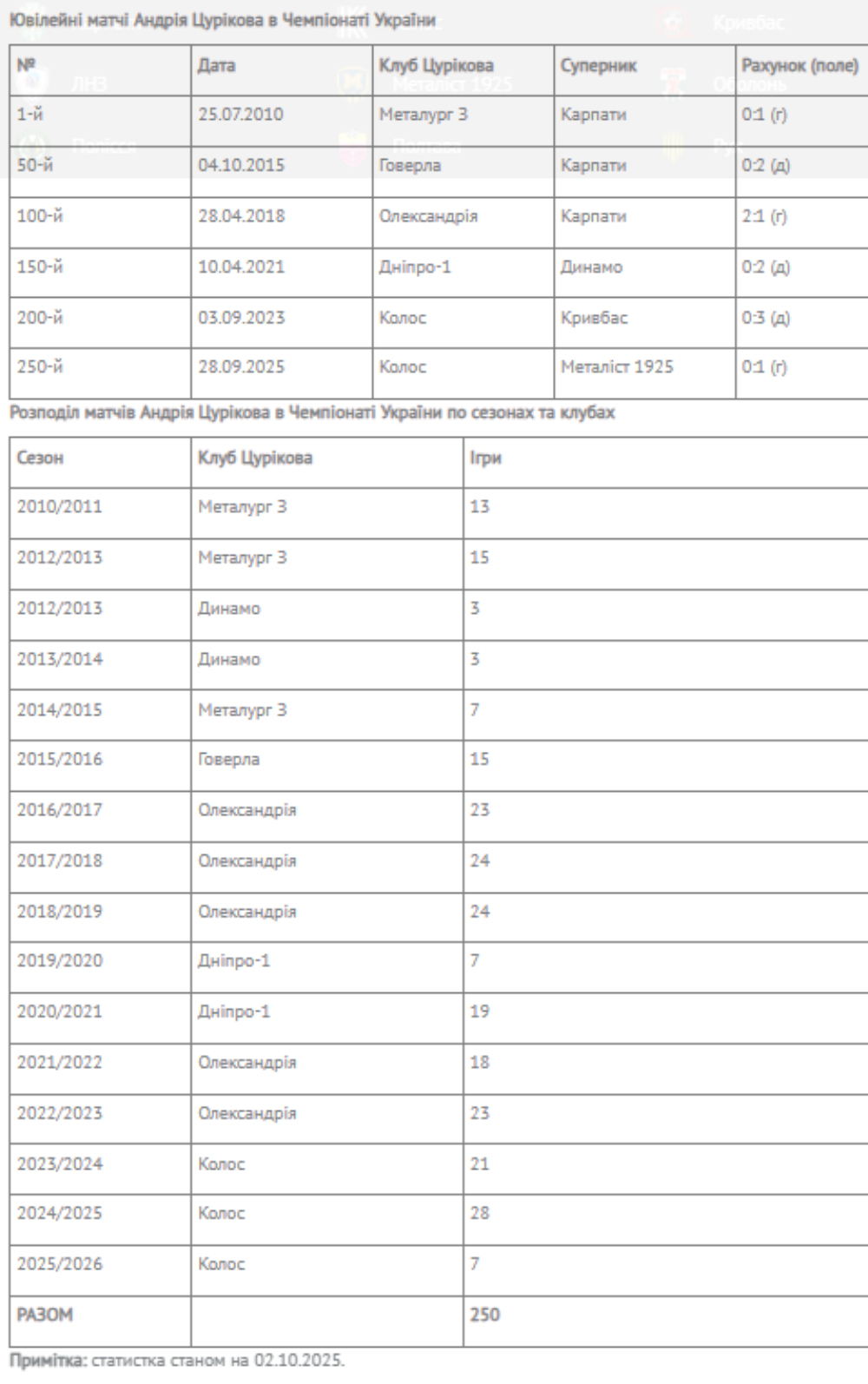 Матч 7-го тура VBET Украинской Премьер-лиги против "Металлиста 1925" (0:1) стал для 32-летнего защитника "Колоса" Андрея Цурикова юбилейным, 250-м (!), в чемпионате Украины.