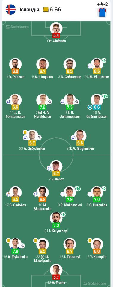 Статистический портал Sofascore поставил оценки игрокам сборной Украины за матч с Исландией.