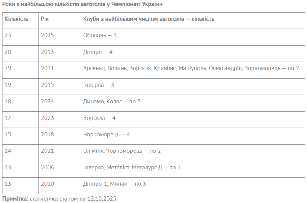 В истории чемпионата Украины 2025 год уже стал самым богатым по количеству автоголов