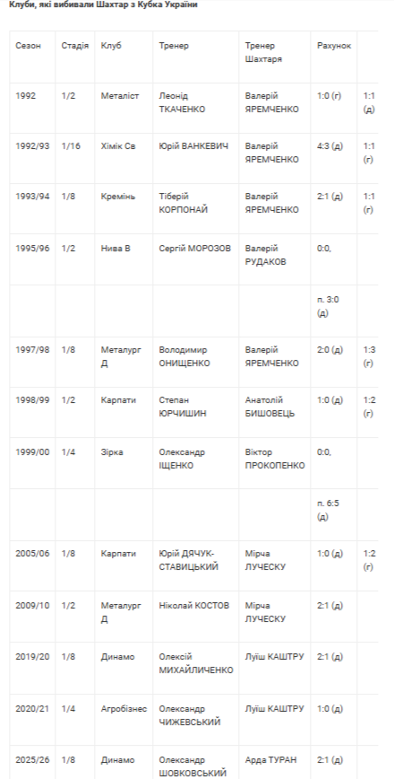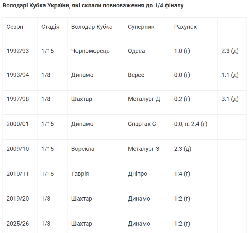 Восьмой раз в истории обладатель Кубка Украины досрочно сложил полномочия, не дойдя даже до четвертьфинала. Трижды сходил с дистанции на ранних стадиях "Шахтер", дважды – "Динамо", по разу – "Черноморец", "Ворскла" и "Таврия".