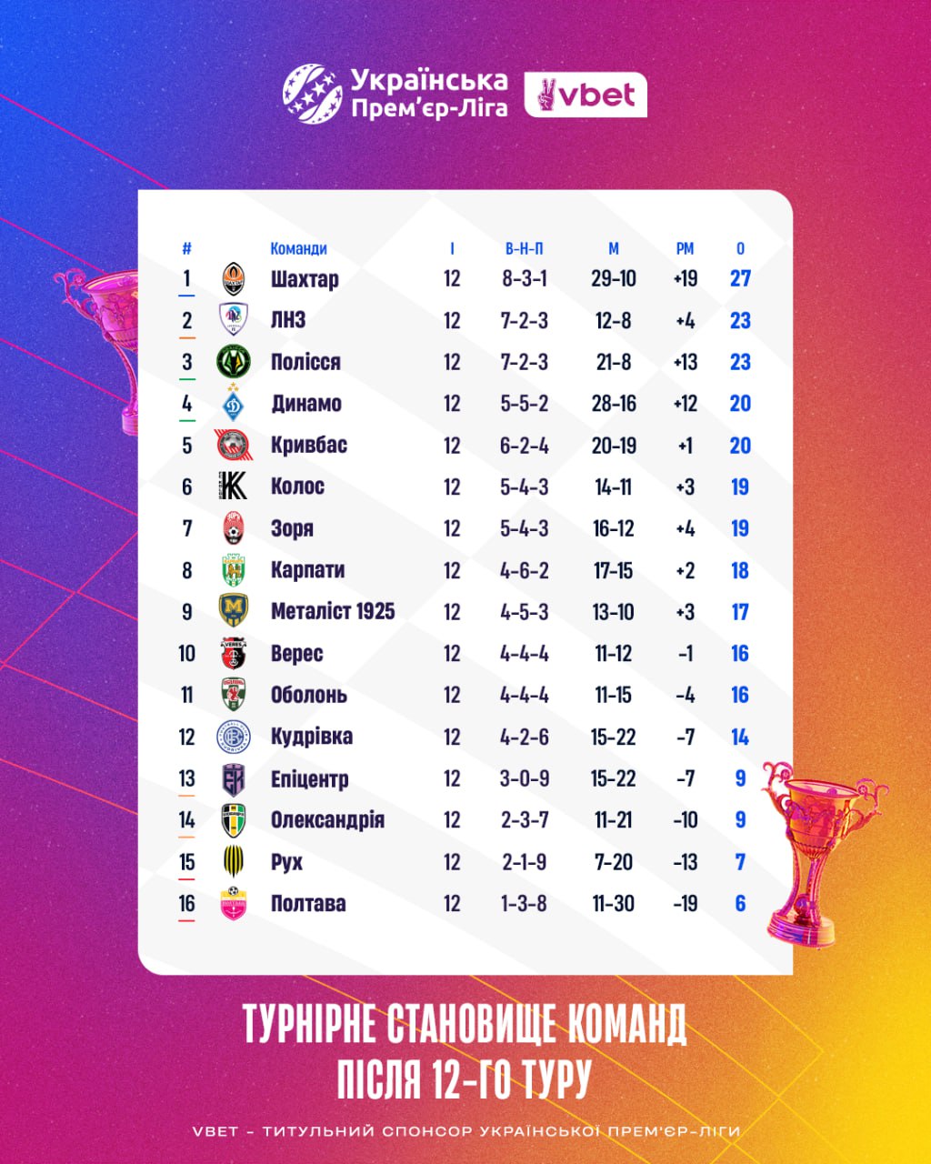 "Динамо" на четвёртом месте. Турнирная таблица УПЛ после 12-го тура