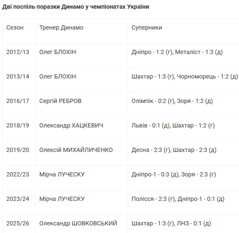 Киевляне в 8-й раз в истории проиграли два матча подряд в чемпионатах Украины.