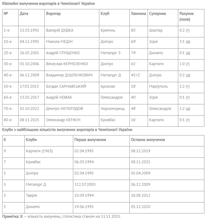 В матче 12-го тура УПЛ "Карпаты" — "Кривбасс" (1:0) на 16-й минуте матча увидел перед собой красную карточку вратарь криворожского клуба Александр Кемкин. Это удаление стало юбилейным, 80-м, для вратарей за всю историю проведения чемпионата Украины.
