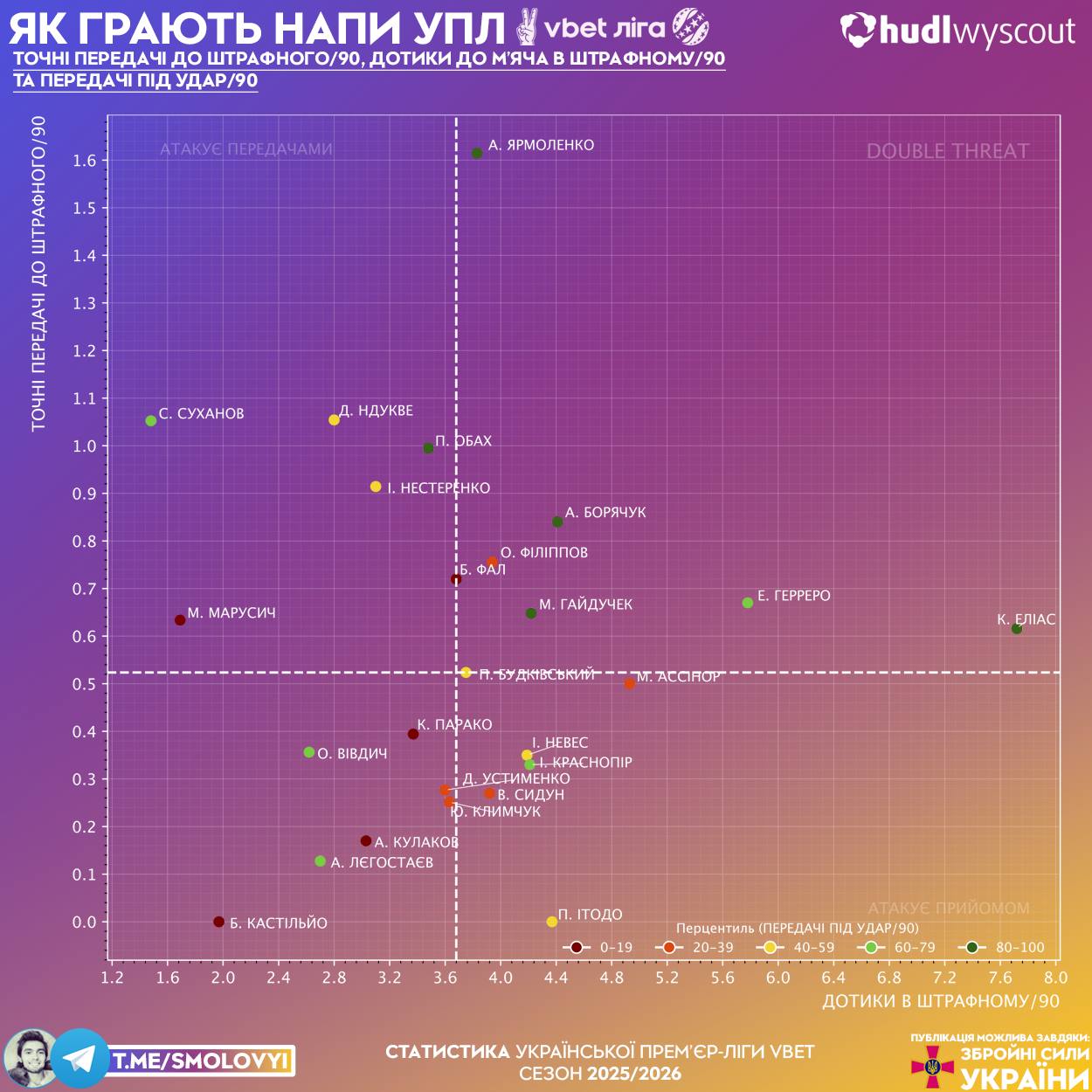 Кауан Элиас (7.72/90) существенно оторвался от Эдуардо Герреро (5.78/90) по прикосновениям к мячу в штрафной. По голам разница минимальная (4:3). Панамец приближается к зоне настоящего double threat, но к уровню Ваната на его лучших отрезках еще далеко. Именно поэтому с помощью Андрея Ярмоленко пытаются придать вариативность позиционной атаке.