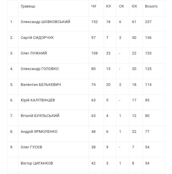 ЧУ – чемпіонат України; КУ – Кубок України; СК – Суперкубок України; ЄК – єврокубки.