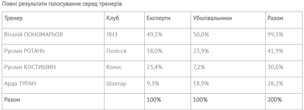 Среди тренеров убедительную победу одержал руководитель ЛНЗ Виталий Пономарев — второй раз подряд. Болельщики отдали ему 50% голосов, эксперты поменьше (49,3%). В итоге - 99,3%.