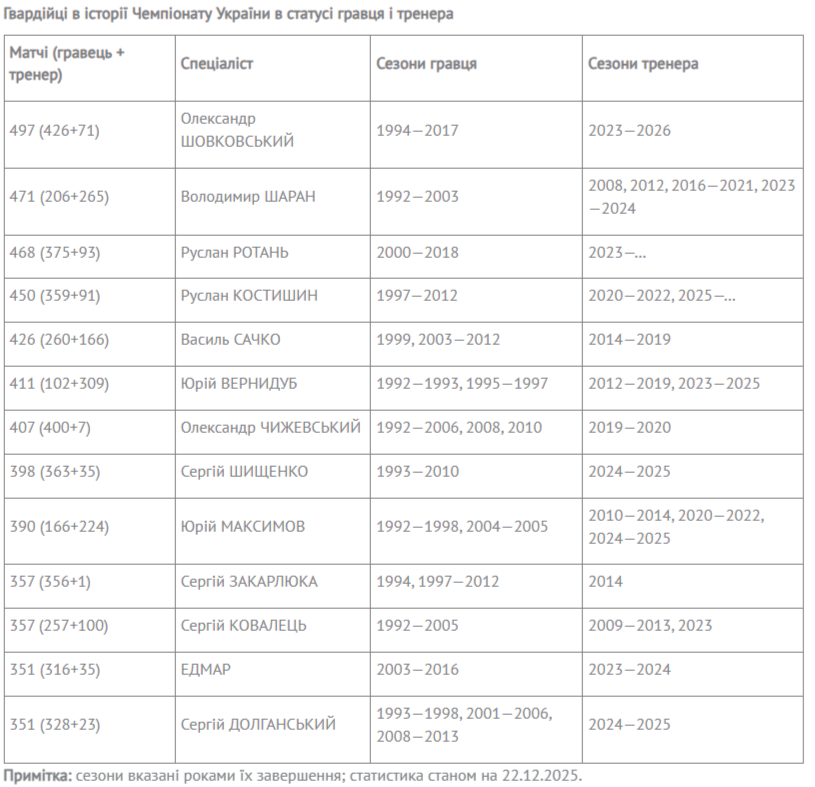 Руслан Костышин провел юбилейный матч по сумме двух статусов в УПЛ. Лидирует в этом рейтинге Александр Шовковский