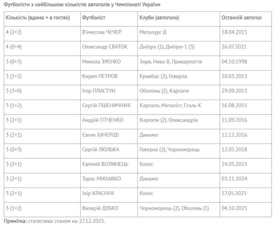 В 8-м туре сезона 2025/26 защитник "Оболони" Валерий Дубко в игре с "Вересом", срезав мяч в ворота своей команды, записал в свой пассив уже 3-й автогол в УПЛ и вошел в число футболистов с наибольшим количеством "самострелов" в истории турнира.