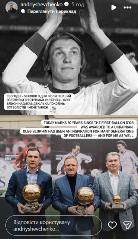Блохин вдохновлял несколько поколений футболистов и меня тоже", - написал Шевченко в инстаграме.