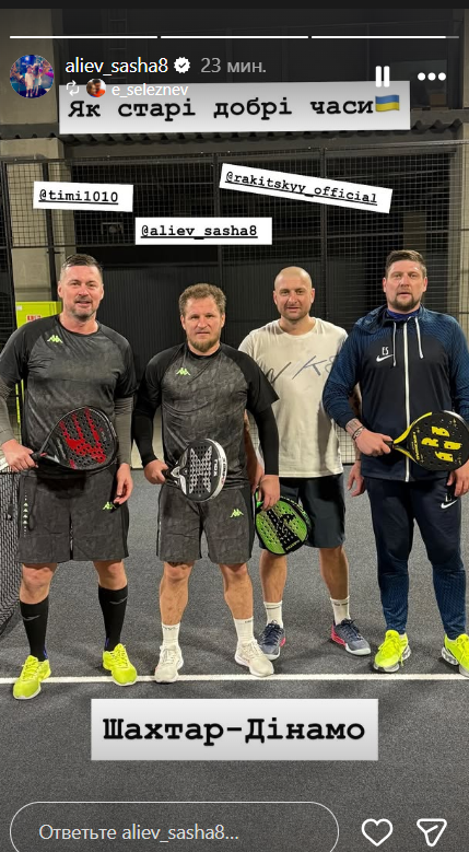 Экс-хавбек Динамо Александр Алиев в сторону на своей странице в Инстаграмме опубликовал видео, где он готовится играть в падел в паре с Артемом Милевским против Евгения Селезнева и Ярослава Ракицкого.