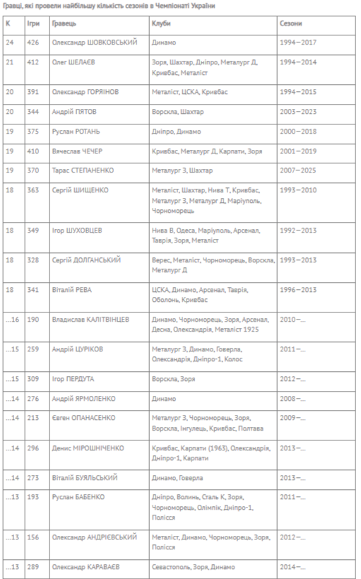 Продолжает уверенно возглавлять этот рейтинг многолетний вратарь "Динамо" Александр Шовковский, участвовавший в 24-х (!) сезонах.