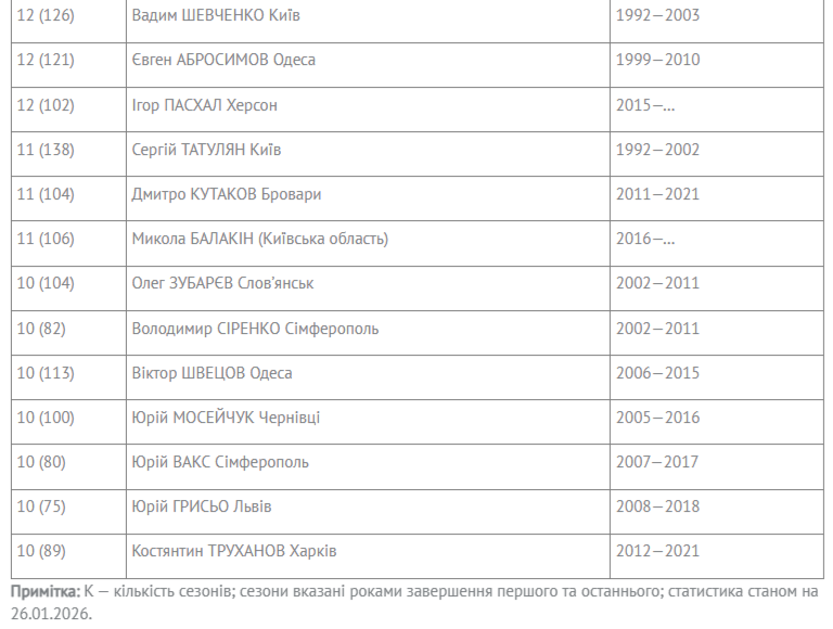 Лидерство разделяют Сергей Шебек (Киев), Игорь Ищенко (Киев/Хмельницкий), Виталий Годулян (Одесса) и Александр Дердо (Черноморск) по 17 сезонов.