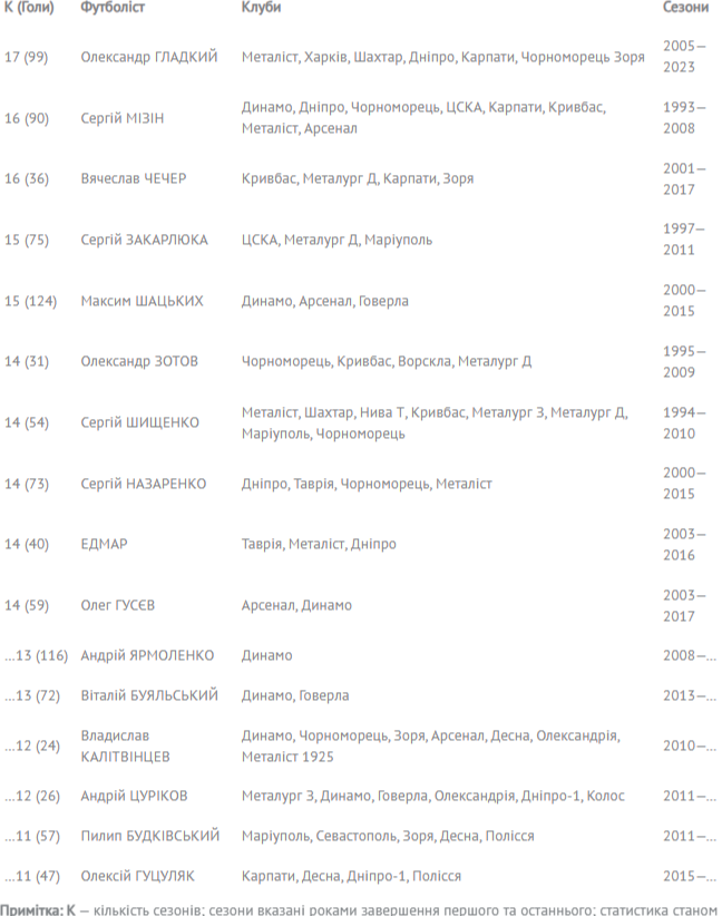 Сезон 2025/26 стал 13-м с забитыми мячами для Андрея Ярмоленко и Виталия Буяльского (оба — "Динамо"). Они находятся в одном шаге от топ-10 футболистов с самым большим количеством голевых сезонов в истории чемпионата Украины.