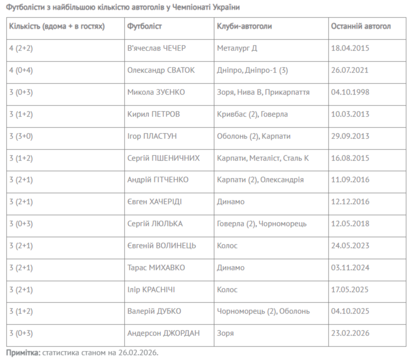 В 17-м туре текущего сезона чемпионата Украины защитник "Зари" Андерсон Джордан в игре с "Кудривкой" дважды срезал мяч в свои ворота. Общее количество "самострелов" бразильского защитника в УПЛ увеличилось до 3-х.