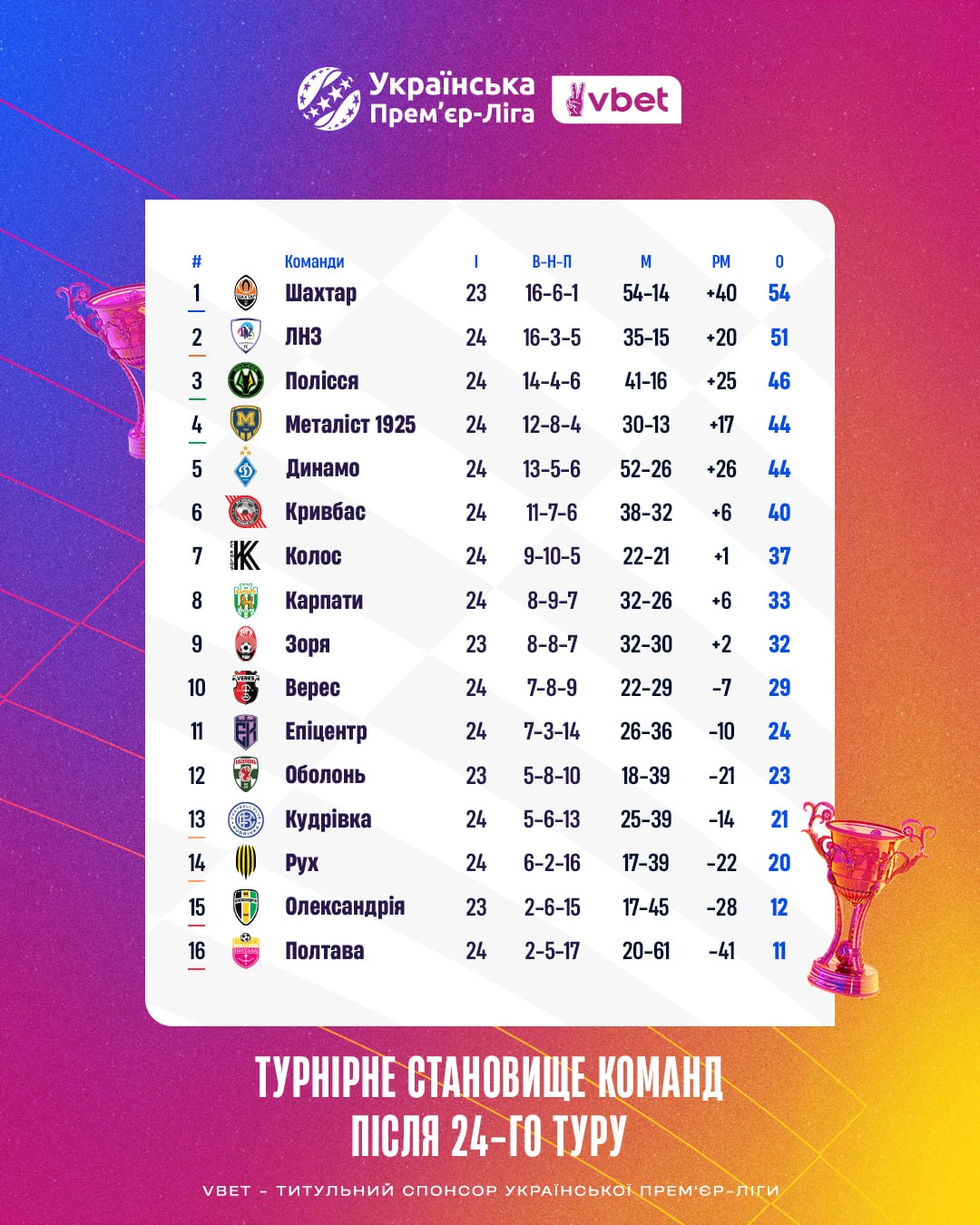 "Динамо" осталось два очка до медалей УПЛ. Турнирная таблица после 24-го тура