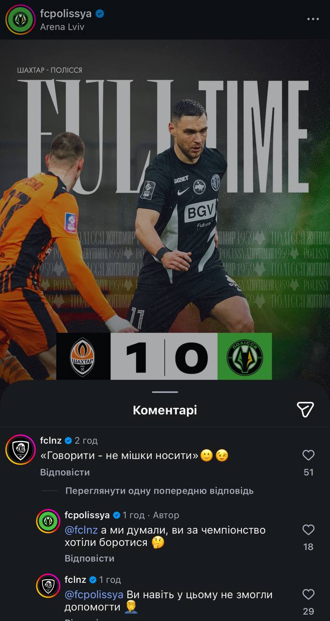 Под новостью о поражении "Полесья" от "Шахтера" пресс-служба ЛНЗ написала: "Говорить – не мешки носить".