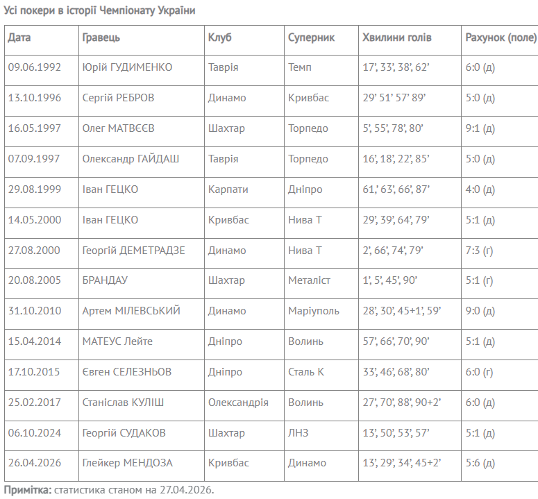 В матче 25-го тура "Кривбасс" — "Динамо" венесуэльский полузащитник криворожского клуба Глейкер Мендоса забил 4 гола, оформив свой первый покер в УПЛ (в 28-й игре).