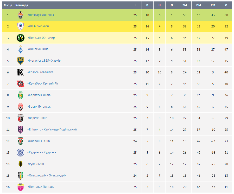 Предлагаем Вашему вниманию турнирную таблицу УПЛ после 25-го тура.