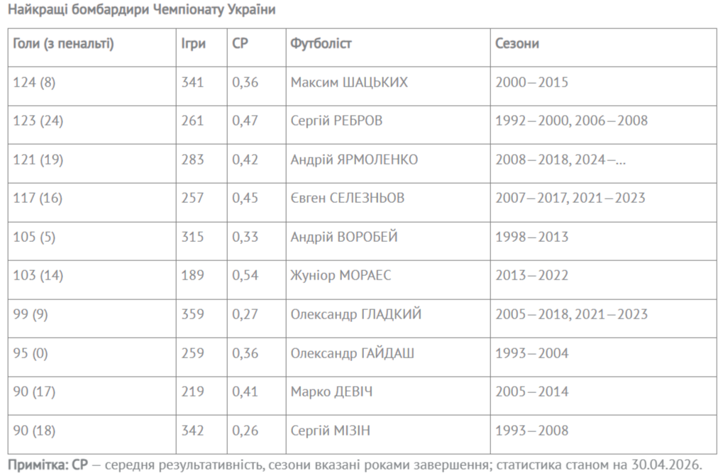 После матча "Кривбасс" - "Динамо" произошло изменение в историческом списке лучших бомбардиров чемпионата Украины. Лидером в этом рейтинге остается Максим Шацких, в активе которого 124 гола. В Кривом Роге Андрей Ярмоленко увеличил число своих голов в рамках чемпионата до 121-го и снизил отставание от второго места в рейтинге голеадоров.