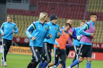 Игроки сборной Украины разминаются перед матчем с македонцами на стадионе "Филиппа II"