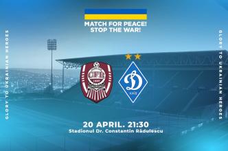 В среду, 20 апреля, румынский ЧФР 1907 Клуж примет киевское Динамо в благотворительном матче в рамках европейского турне под лозунгом Match for Peace! Stop the War!» («Матч за Мир! Остановим Войну!»).Начало встречи на стадионе Stadionul Dr...