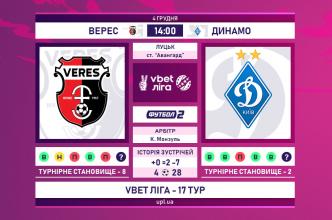 Статистическое превью матча 17-го тура VBET лиги "Верес" - "Динамо".Арбитр: Екатерина Монзуль (Харьков) провела 58 игр в УПЛ.История встречВсего сыграно 9 матчей: +0=2-7 мячи 4-28На поле Вереса - 4 матча: +0=1-3 мячи 2-8В УПЛ сыграно 7 матчей: +0=0-7 мячи 3-27На поле Вереса - 3 матча: +0=0-3 мячи 2-8Последний матч на поле Вереса — 18.09.1994...
