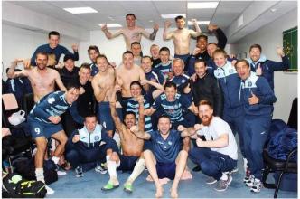 Радость игроков "Олимпика" в раздевалке после победы над "Динамо"