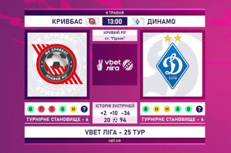 (Публикуется на языке оригинала)У понеділок, 8 травня, київське «Динамо» проведе матч 25-го туру VBET Ліги проти криворізького «Кривбасу». Зустріч пройде у Кривому Розі на стадіоні «Гірник».Наразі